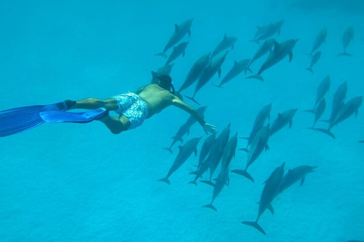Pickup from Hotel about 07:30/ 08:00AM . – A comfortable, air-conditioned vehicle collects you from your hotel in Marsa Alam, transfer to the marina. -There, you’ll board a boat and set off on an unforgettable journey to the famous Dolphin House, also known as Sha’ab Samadai—one of the best spots in the Red Sea to encounter wild dolphins. Before arriving at the site, your snorkeling guide will give a short briefing about the area.